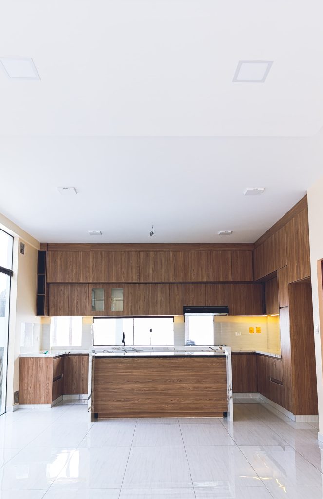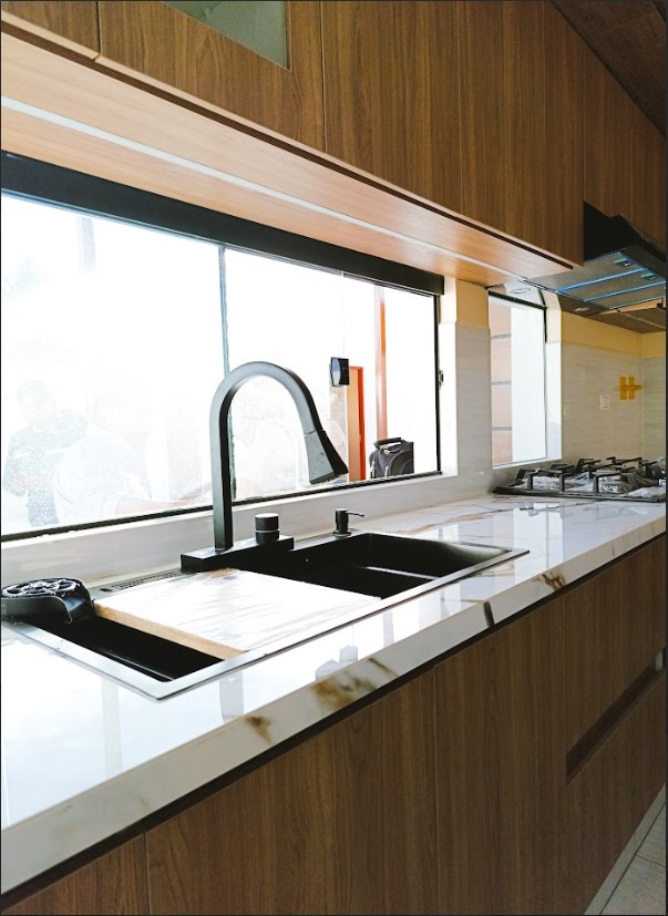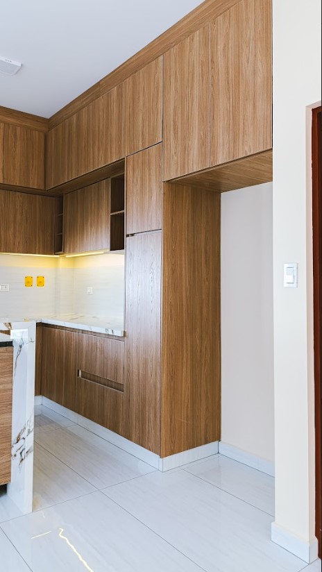 Acabados en tonos madera natural que combinan elegancia y durabilidad.