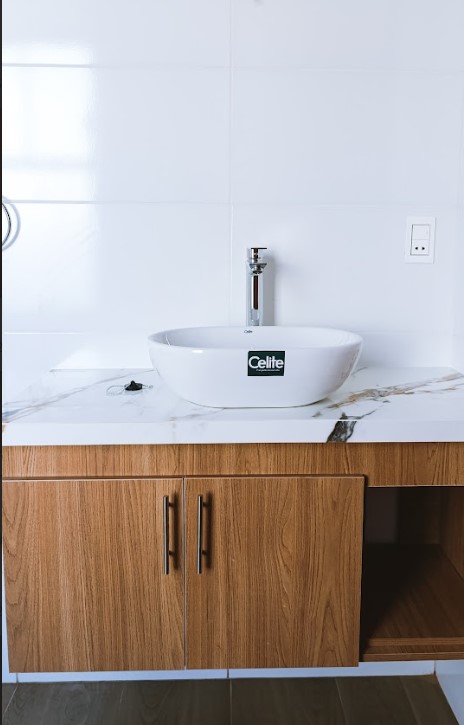 Baños equipados con muebles de diseño contemporáneo en tonos madera, combinados con encimeras de cuarzo y grifería cromada de alta gama.