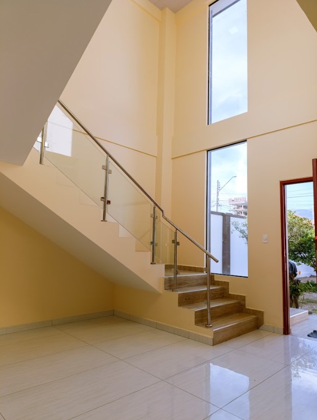 Escalera con barandal de vidrio templado y acero inoxidable que aporta elegancia y modernidad.
