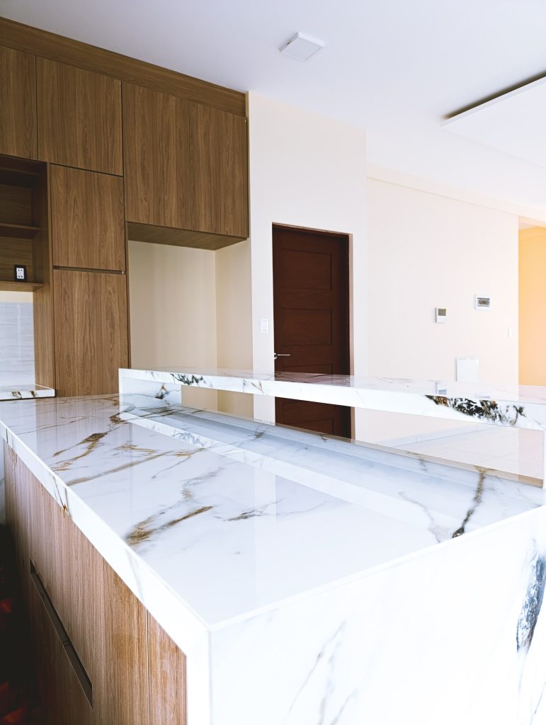 Cocina integral con muebles en madera de nogal y encimeras de cuarzo blanco con vetas naturales.