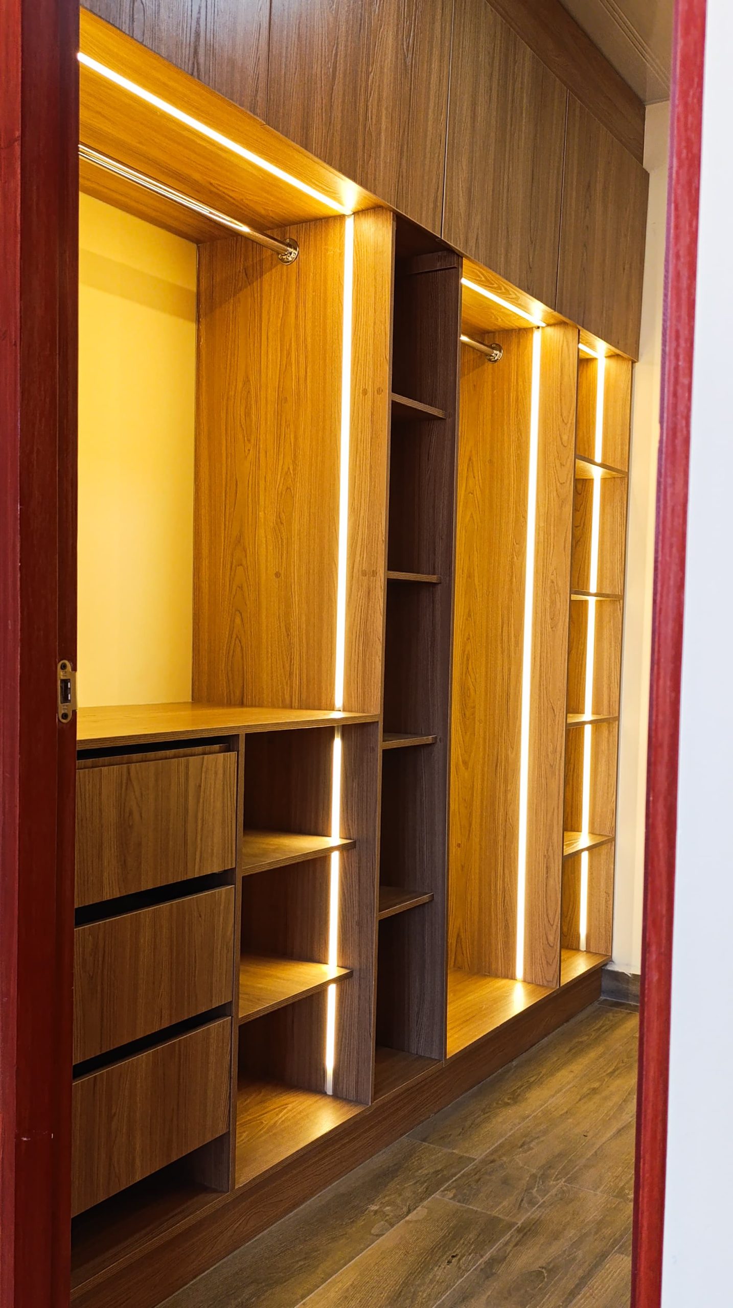 Closets empotrados elaborados en madera con iluminación LED integrada. Diseños funcionales con múltiples compartimentos, cajones y áreas de almacenamiento.