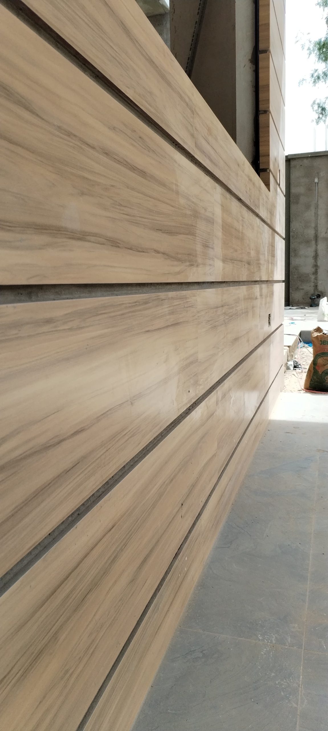 Detalles de enchape en madera natural que aportan calidez al diseño contemporáneo. Instalación horizontal tipo siding con acabados protegidos contra intemperie.